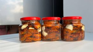 Небольшие банки поочередно заполняем вялеными помидорами, нарезанным тонкими ломтиками чесноком и заливаем маслом с пряностями